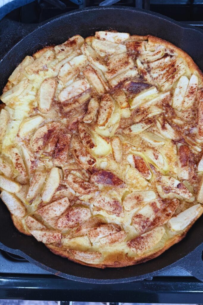 - Transfer the cast iron skillet with apples and batter to the preheated oven. Bake for 25 to 30 minutes, or until the apples begin to golden and the batter is cooked in the center.