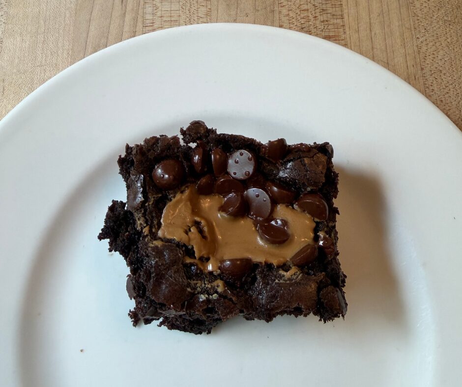- Add 12 (or more!) dollops of cookie butter on top of the brownie batter. Press down lightly into the batter. Sprinkle a few chocolate chips onto the cookie butter.